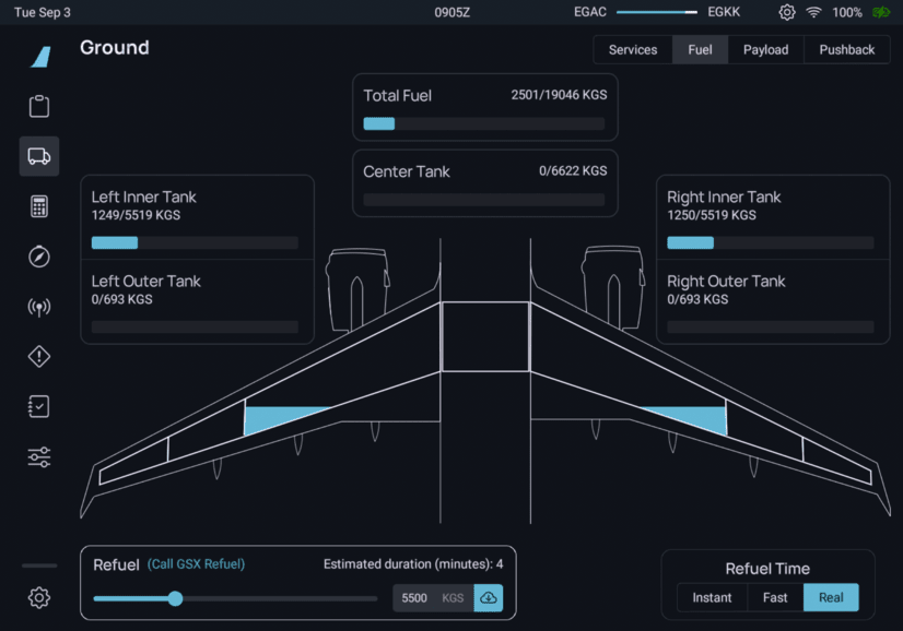 RealorFast. SelectingInstantwill add the fuel immediately, and will not involve GSX. - Ensure you have synchronised your required fuel with your SimBrief flight plan, or manually adjust the slider to set how much fuel you require.