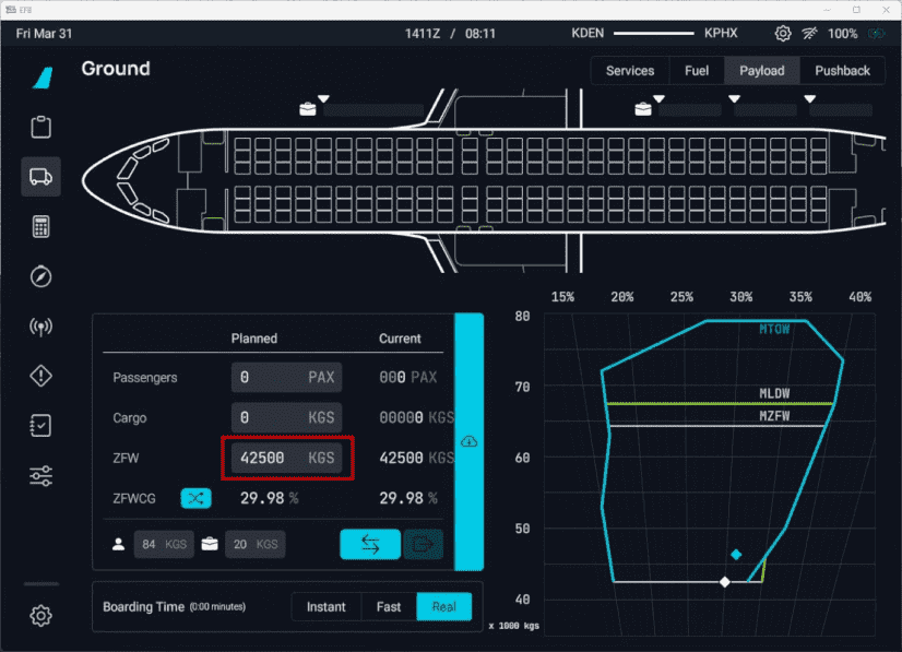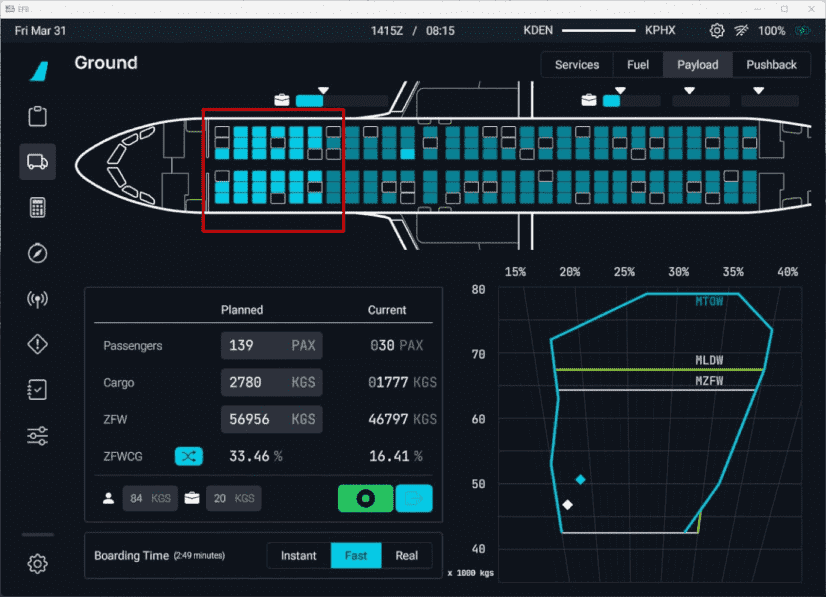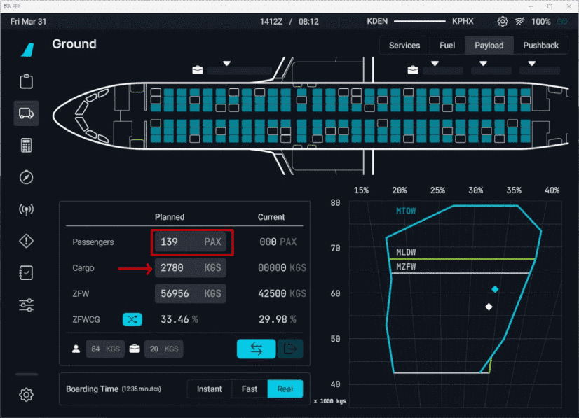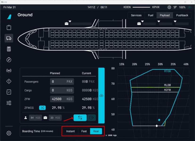 Once you are happy with the passenger count and weights calculated, you can start boarding by pressing the cyan "Boarding" button in the boarding time section. This field also allows you to customize how quickly passengers enter the aircraft.