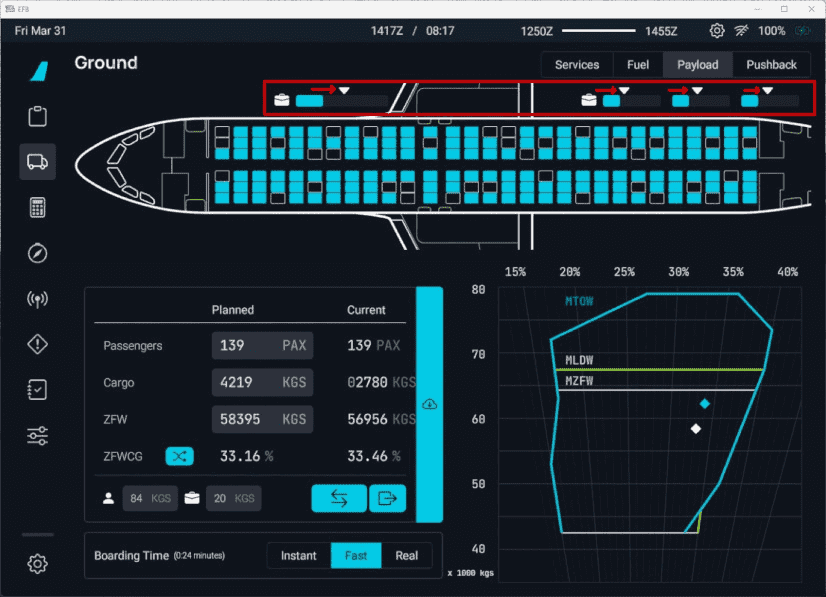 We have introduced a new flight model paired with a new weight and balance payload method that incorporates seat rows and the correct center of gravity.