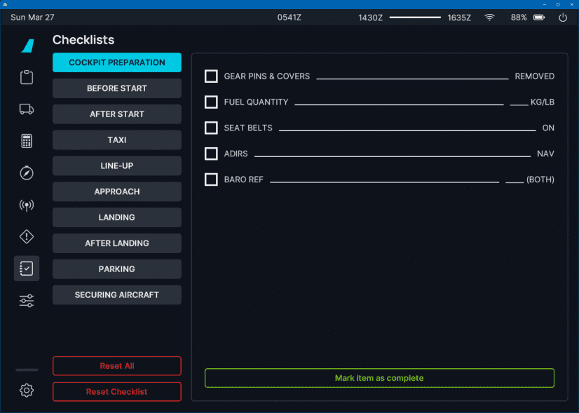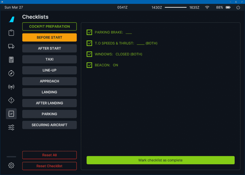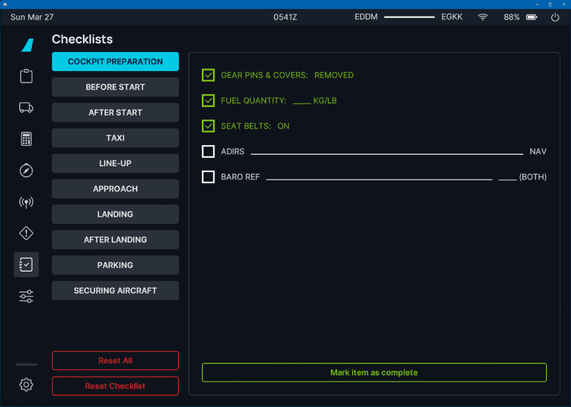 The flyPad checklists are modelled after the official Airbus checklist. You can also download this checklist here: Checklist and SOP.