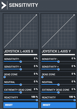 Set all sensitivity settings to 0%. This includes Sensitivity + and -, Dead Zone, Neutral, and Extremity Dead Zone. Leave Reactivity at 100%.