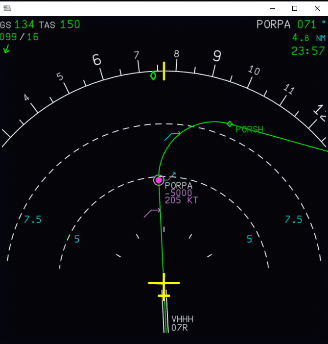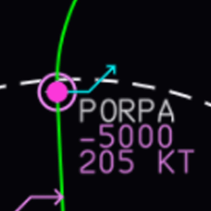 PORPAthere are a few different indicators described in more detail below. This is a result of information entered into the F-PLN page on the MCDU. - The final pseudo waypoint displayed is a cyan arrow indicating the point where the FCU commanded altitude (in our case, 7000 ft) will be reached.