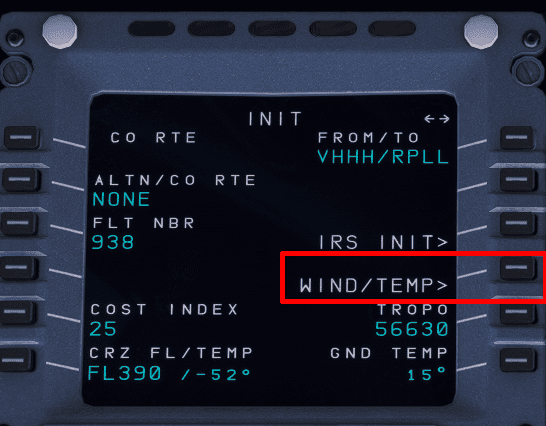 In order to improve accuracy and have a valid Top of Descent, entering the winds is an important aspect of flight planning and setting up the MCDU. You can find the WIND/TEMPS easily on the INIT A page.