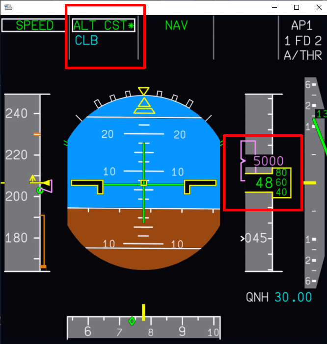 ALT CST*as you capture the altitude constraint set in the MCDU. CLBwill be armed in blue indicating further climb is expected as set in your FCU.- The altitude indicator will show the targeted altitude of 5000 ft in magenta.