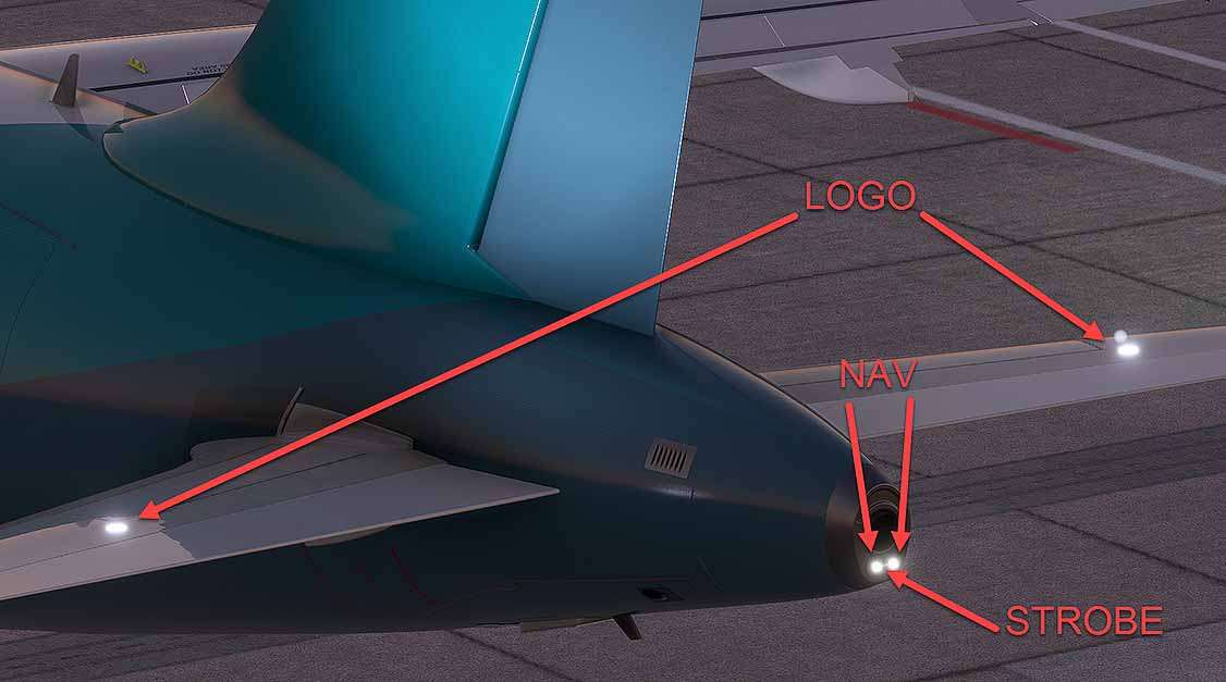 Logo lights are installed in the upper surface of each horizontal stabilizer to illuminate the company logo on the vertical stabilizer, provided the main gear struts are compressed, or the slats are extended.
