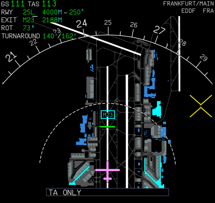 The OANS features a moving airport map on the flight crew's navigation display (ND). Any airport contained in the Navigraph AMDB database can be selected for display.