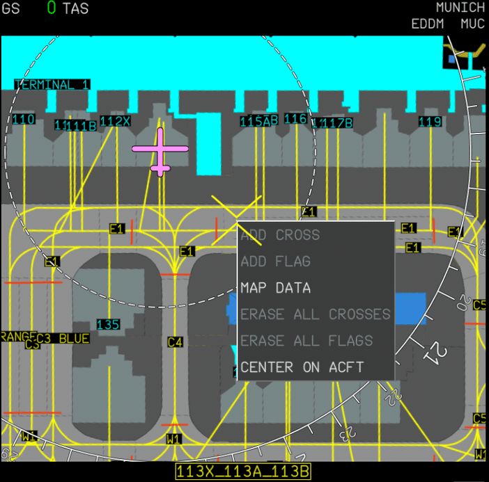 The OANS airport map is active in ROSE NAV, ARC and PLAN EFIS modes. In PLAN mode, any airport of the database can be displayed. In all modes, the center of the map can be moved using the mouse (click and drag in the navigation display).