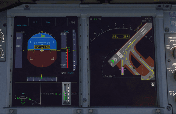 As part of the descent preparations, BTV is usually set up. After having selected the landing runway in the FMS, switch the EFIS mode selector to PLAN, turn the range selector to ZOOM and load the destination airport using the OANS control panel. The airport map now shows your destination airport, with the FMS landing runway marked with a green arrow in front of the runway identifier (QFU). Clicking on the runway identifier selects this runway for BTV.